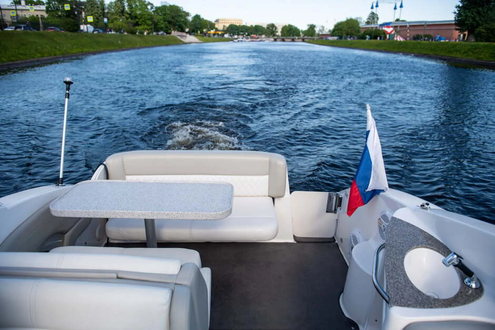 На катере предусмотрено несколько удобных зон отдыха. В носовой части находится панорамная площадка — здесь приятно наслаждаться видами исторического центра и делать красивые фотографии на фоне набережных и мостов. На корме расположена открытая зона с диванами и столиком — отличное место для общения и небольшого фуршета. Также на борту есть закрытая гостиная с мягкими диванами и столом, где можно комфортно разместиться в любую погоду.